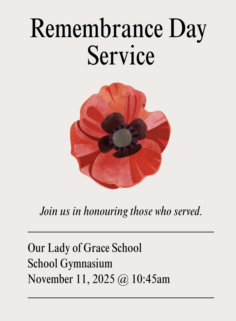 Remembrance Day Service Join us in honouring those who served. Our Lady of Grace SchoolSchool GymnasiumNovember 11, 2025 @ 10:45am